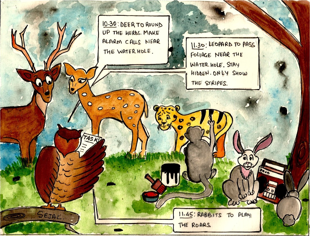 The Owl assigns tasks every morning. Deer to round up the herds and fake alarm calls to get tourists excited about a hunt. Leopard, now in make-up, to sprint across foliage pretending to be a tiger. Rabbits to intermittently play tiger roars from a recording device.